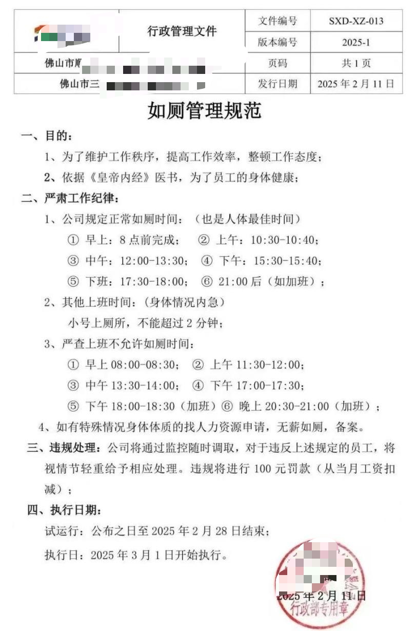 公开报道显示,今年3月广东某企业发布《如厕管理规范》称,为维护工作秩序,提高工作效率,整顿工作态度,要求员工需在指定时间段内如厕,其他上班时间“小号上厕所不能超过2分钟”,违规将扣款100元。该公司后来回应媒体称,这是试运行文件,发布后员工不认可,所以并未实施。此前有员工如厕约一个小时,制定规范意在警示。